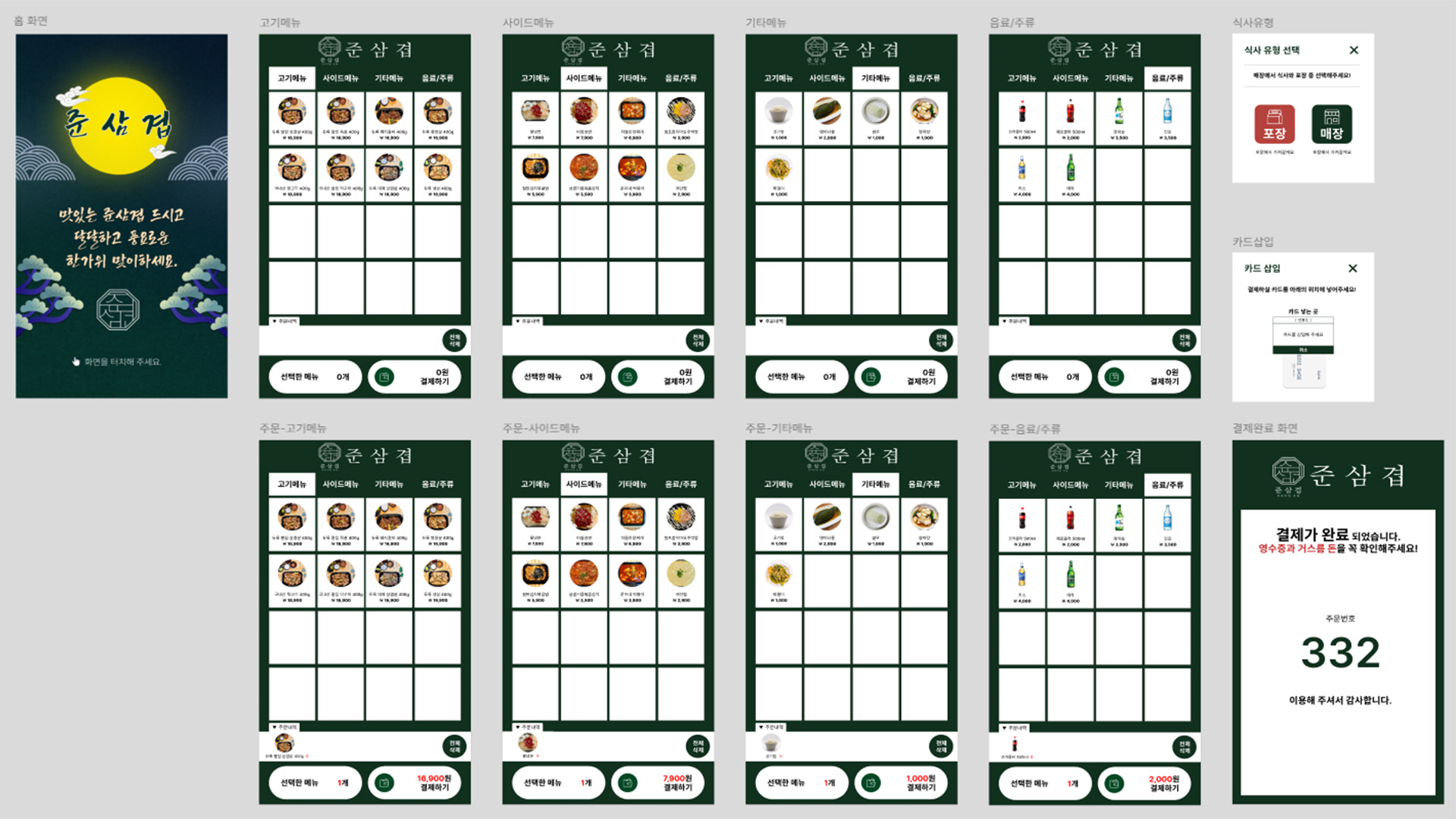 브랜드 로고의 분위기를 고려한 색상 선택과 제작 당시에 추석을 앞두고 있어서 한가위 느낌의 키오스크 초기 화면을 만들어 보았습니다.